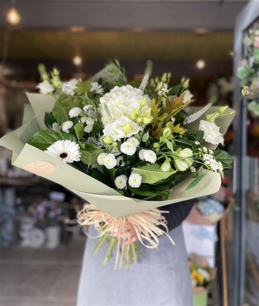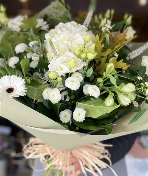 A naturally styled hand-tied bouquet showcasing hydrangea surrounded by a range of neutral flowers and rich autumnal greenery.