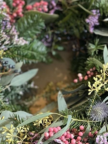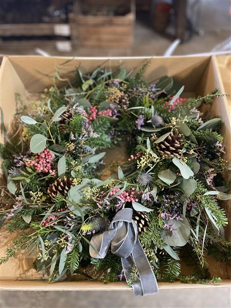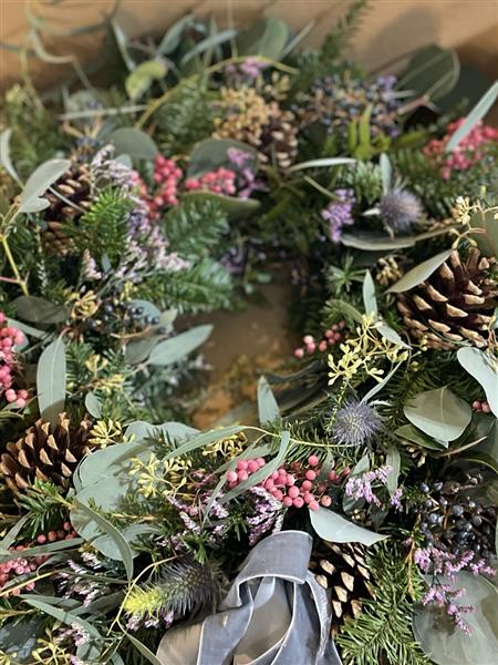 Our luxury Balmoral door wreath approximately 18" with scented, festive foliage with scented rosemary and eucalyptus and includes limonium, viburnam berry, thistle and exquisite pepper berries (eeek!) finished with natural pine cones and a gorgeous velvet grey ribbon - all materials that will last well and naturally air dry.