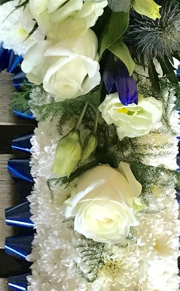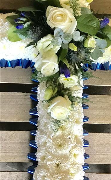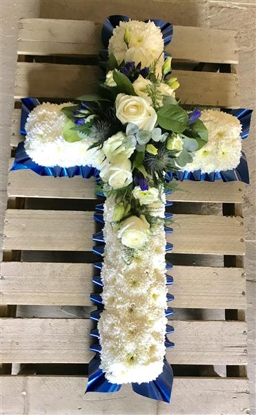 A classic based cross design with roses available in your choice of colours of ribbon and focal flowers. The standard price is for a 2' design.