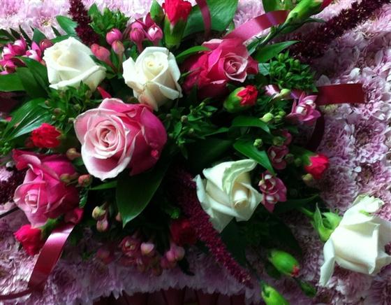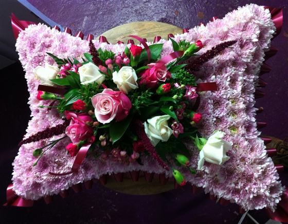 A pillow based in pink chrysanthemums and complimented with a spray of flowers and ribbon. This tribute can be created in your colour choice.