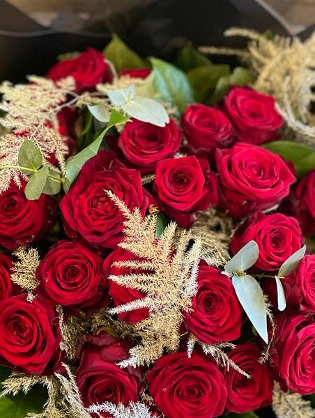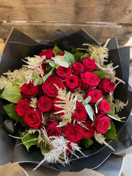 Our bronzed goddess is a bouquet of 24 luxury roses with metallic bronzed asparagus giving a luxury touch to these gorgeous roses beautifully wrapped in our large aqua box bouquet and finished with branded ribbon.