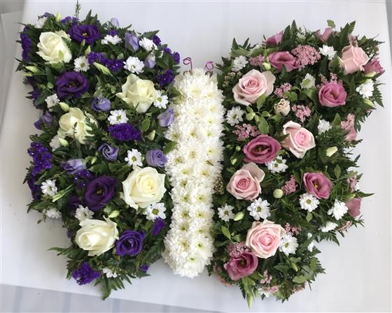 Butterfly tribute usually made with both wings matching, this tribute is shown with one pink and one purple as per customers request. Order online with your choice of colours or ring to discuss options available.