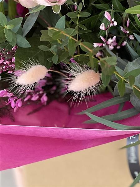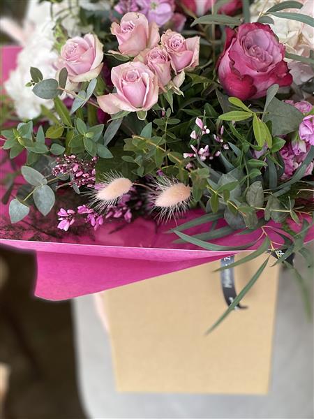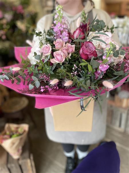 This stunning, highly scented hand tied design in lilacs and pinks showcases the most gorgeous blooms of roses, hydrangea, stocks and snapdragons with pops of pink bunny tails.