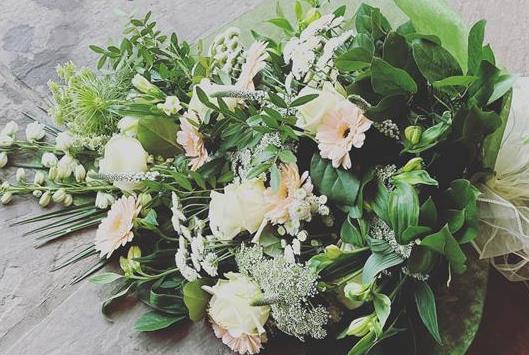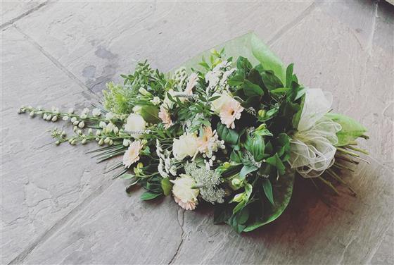 A selection of seasonal blooms presented as a traditional floral sheaf in a range of colour options.