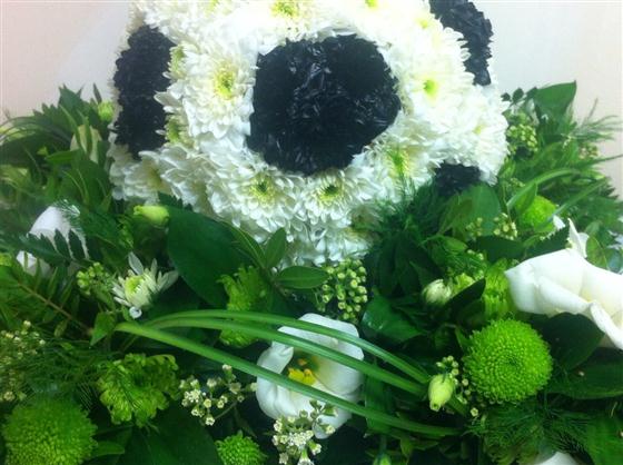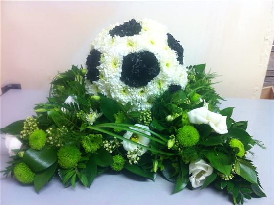 A bespoke tribute of a football resting in a loose foliage section. The football colours can be changed to reflect the team colours if necessary.
