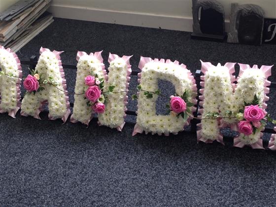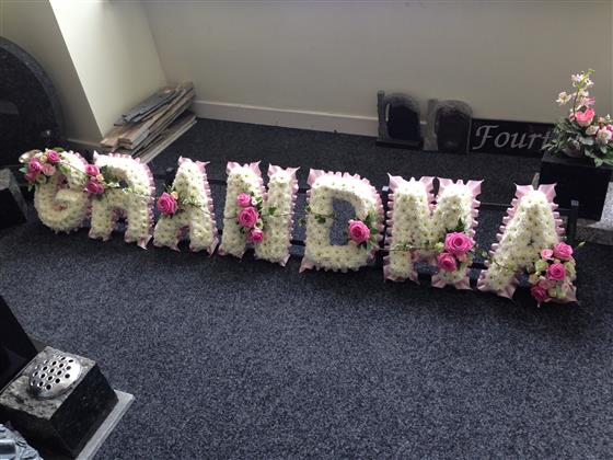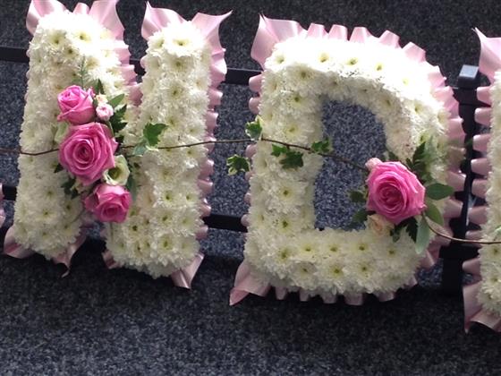 GRANDMA shown here based in chrysanthemums with pink ribbon and pink rose sprays. Our based letters can be created for any name or relative such as MUM, SISTER, AUNTIE etc or personalised name can be created in these colours, please select the number of letters required and enter the letters required in the comments eg. GRANDMA and we will contact you if we require clarification or confirmation of any information. Please ensure to enter the name of the deceased as the recipient. Alternatively, please contact us to discuss your preferences.