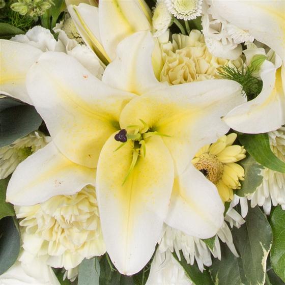 Subtle lemons and creams incorporating lilies and alstromeria combine with delicate solidaster to create this elegant wreath.