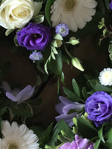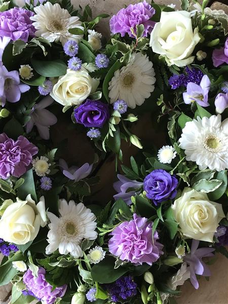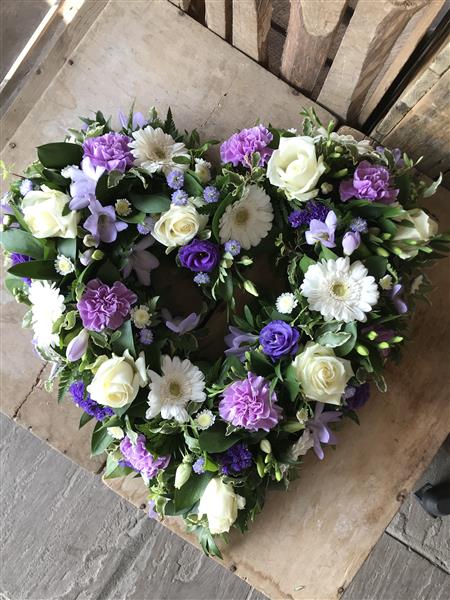 An open heart tribute shown here in lilac, white and purple with roses, freesia, carnations and gerbera.