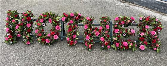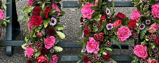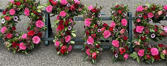 Open/Loose (Foliage and Flowered) Funeral Letters shown here in rich, vibrant pinks & reds using seasonal flowers. The flowers used, unless stipulated will be seasonal choice to suit the colours chosen by the customer.