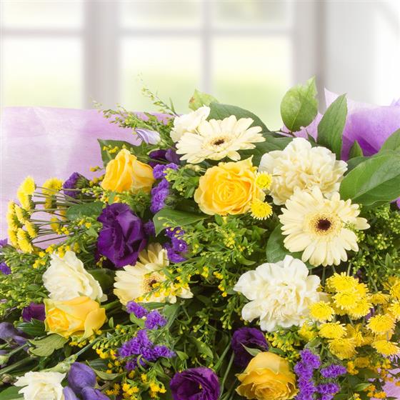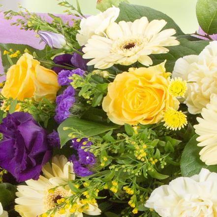 A traditional style bouquet of golds and purples including roses, lisianthus, mini gerberas and solidaster ready to be arranged in a vase.