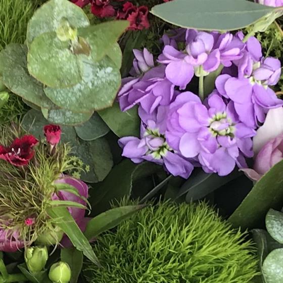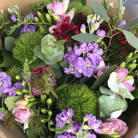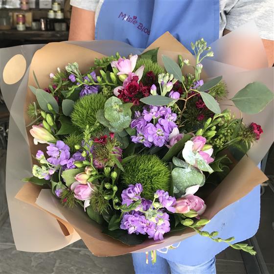 A scented bouquet of stocks, freesia and sweet william to bring the scent of summer flowers indoors. Wrapped in brown paper with raffia bow to compliment this naturally beautiful hand tied.