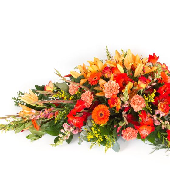 A seasonal casket spray to represent the current season - spring, summer, autumn or winter made with seasonal flowers including roses, lilies, mini gerberas, carnations and antirrhinum.