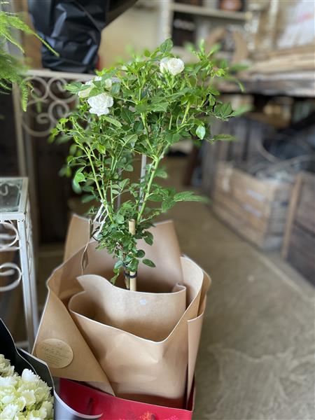 A standard rose bush plant 70cm in height, gift wrapped ready for delivery or collection. Colours may vary from those shown.